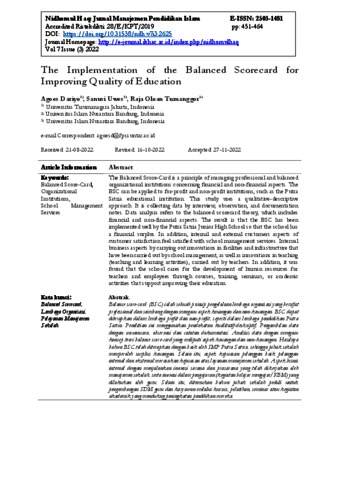 Agoes Dariyo, Pertama and Sanusi Uwes, Kedua and Raja Oloan Tumanggor, Ketiga THE IMPLEMENTATION OF THE BALANCE SCORECARD FOR IMPROVING QUALITY OF EDUCATION. THE IMPLEMENTATION OF THE BALANCE SCORECARD FOR IMPROVING QUALITY OF EDUCATION.