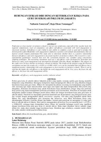 Nathania Tanurezal, Pertama and Raja Oloan Tumanggor, Kedua HUBUNGAN EFIKASI DIRI DENGAN KETERIKATAN KERJA PADA GURU DI SEKOLAH INKLUSI DI JAKARTA. HUBUNGAN EFIKASI DIRI DENGAN KETERIKATAN KERJA PADA GURU DI SEKOLAH INKLUSI DI JAKARTA.