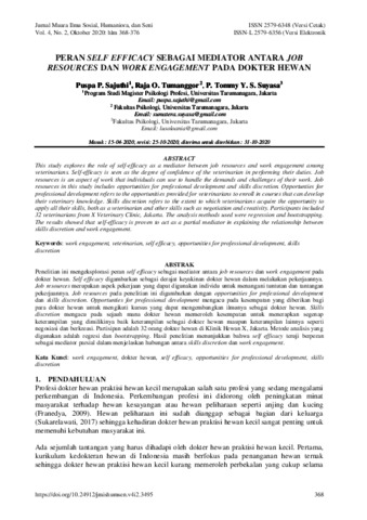 Puspa P. Sajuthi, Pertama and Raja O. Tumanggor, Kedua and P. Tommy Y. S. Suyasa, Ketiga PERAN SELF EFFICACY SEBAGAI MEDIATOR ANTARA JOB RESOURCES DAN WORK ENGAGEMENT PADA DOKTER HEWAN. PERAN SELF EFFICACY SEBAGAI MEDIATOR ANTARA JOB RESOURCES DAN WORK ENGAGEMENT PADA DOKTER HEWAN.