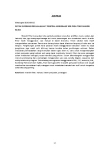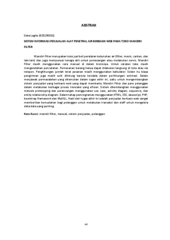 Mandiri Filter merupakan toko jual beli peralatan kebutuhan air (filter, mesin, carbon, dan lain-lain) dan juga mempunyai tenaga ahli untuk pemasangan atau melakukan servis. Mandiri Filter masih menggunakan cara manual di dalam bisnisnya. Untuk catatan toko masih mengandalkan pencatatan. Pemesanan barang hanya dapat dilakukan langsung di toko atau via telepon. Penghitungan jumlah total pesanan masih menggunakan kalkulator. Selain itu biaya pengiriman juga masih sulit dihitung karena kendala dalam perhitungan estimasi. Dalam menjawab permasalahan yang ditemukan dalam tugas akhir ini, yaitu untuk mengembangkan sistem penjualan yang berbasis web yang dapat membantu Mandiri Filter dan para pelanggan dalam melakukan berbagai proses transaksi yang efisien. Sistem dikembangkan menggunakan metode prototyping dan perancangan menggunakan use case, activity diagam, sequence, dan entity relationship diagram. Dalam tahap pemrograman menggunakan HTML, CSS, Javascript, PHP, bootstrap framework dan MySQL. Hasil dari tugas akhir ini adalah penjualan berbasis web sangat memberikan kemudahan bagi pelanggan untuk melakukan transaksi dan staff untuk mengelola data-data yang penting. Kata Kunci: mandiri filter, manual, sistem penjualan, pelanggan.