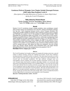 Melia Afriani, Pertama and Rahmah Hastuti, Kedua Gambaran Motivasi Mengajar Guru Tingkat Sekolah Menengah Pertama (SMP) pada Masa Pandemi Covid-19. Gambaran Motivasi Mengajar Guru Tingkat Sekolah Menengah Pertama (SMP) pada Masa Pandemi Covid-19.
