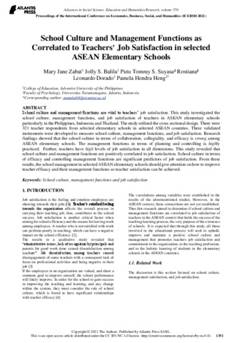 Mary Jane Zabat, Pertama and Jolly S. Balila, Kedua and Putu Tommy S. Suyasa, Ketiga and Rostiana, Keempat School Culture and Management Functions as Correlated to Teachers’ Job Satisfaction in selected ASEAN Elementary Schools. School Culture and Management Functions as Correlated to Teachers’ Job Satisfaction in selected ASEAN Elementary Schools.