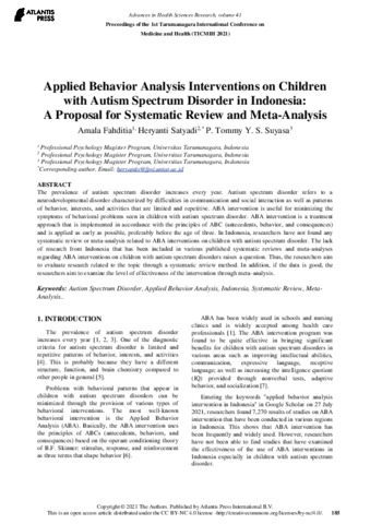 Amala Fahditia, Pertama and Heryanti Satyadi, Kedua and P. Tommy Y. S. Suyasa, Ketiga Applied Behavior Analysis Interventions on Children with Autism Spectrum Disorder in Indonesia: A Proposal for Systematic Review and Meta-Analysis. Applied Behavior Analysis Interventions on Children with Autism Spectrum Disorder in Indonesia: A Proposal for Systematic Review and Meta-Analysis.