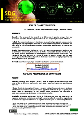 Siahaan, FX and Rahayu, Mella Ismelina F and Gunadi, Ariawan (2024) Role of Quantity Surveyor. Journal of Law And Sustainable Development. ISSN 2764-4170