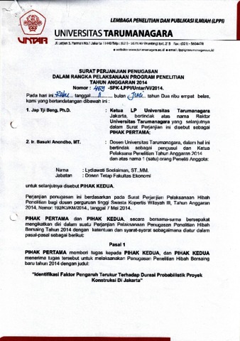 Basuki Anondo, Pertama and Lydiawati Soelaiman, Kedua Identifikasi Faktor Pengaruh Terukur Terhadap Durasi Probabilistik Proyek Konstruksi Di Jakarta. Identifikasi Faktor Pengaruh Terukur Terhadap Durasi Probabilistik Proyek Konstruksi Di Jakarta.