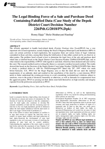 Djaja, Benny and Harahap, Shela Oktaharyani The Legal Binding Force of a Sale and Purchase Deed Containing Falsified Data (Case Study of the Depok District Court Decision Number 226 2018 PN.Dpk). 3rd Tarumanagara International Conference on the Applications of Social Sciences and Humanities.
