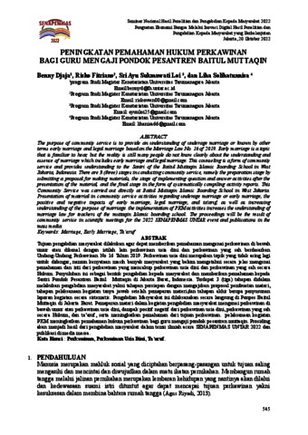 Djaja, Benny and Fitriano, Risko and Loi, Sri Ayu Sukmawati and Solihatunnisa, Liha Peningkatan Pemahaman Hukum Perkawinan Bagi Guru Mengaji Pondok Pesantren Baitul Muttaqin. SENAPENMAS 2022.