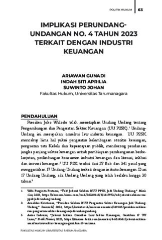 Gunadi, Ariawan and Aprilia, Indah Siti and Johan, Suwinto IMPLIKASI PERUNDANG-UNDANGAN NO. 4 TAHUN 2023 TERKAIT DENGAN INDUSTRI KEUANGAN. Fakultas Hukum Universitas Tarumanagara.