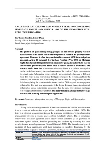Candra, Hardianto and Djaja, Benny (2022) ANALYSIS OF ARTICLE 6 OF LAW NUMBER 4 YEAR 1996 CONCERNING MORTGAGE RIGHTS AND ARTICLE 1400 OF THE INDONESIAN CIVILCODE ON SUBROGATION. Syntax Literate: Jurnal Ilmiah Indonesia, 7 (10). ISSN 2548-1398