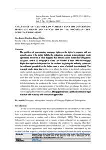 (NOMOR 26) ANALYSIS OF ARTICLE 6 OF LAW NUMBER 4 YEAR 1996 CONCERNING MORTGAGE RIGHTS AND ARTICLE 1400 OF THE INDONESIAN CIVIL CODE ON SUBROGATION.pdf Download (299kB) | Preview |