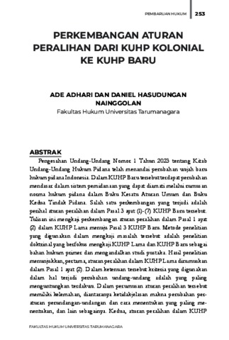 Adhari, Ade and Nainggolan, Daniel Hasudungan Perkembangan Aturan Peralihan Dari KUHP Kolonial Ke KUHP Baru. Fakultas Hukum Universitas Tarumanagara.