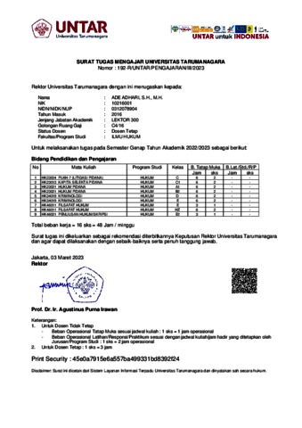 Adhari, Ade Surat Tugas Mengajar. Universitas Tarumanagara.