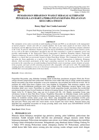 Djaja, Benny and Laurensia, Crusita PEMAHAMAN HIBAH DAN WASIAT SEBAGAI ALTERNATIF PENGELOLAAN HARTA PERKAWINAN KEPADA PELAYANAN KELUARGA EMAUS. SENAPENMAS 2021.