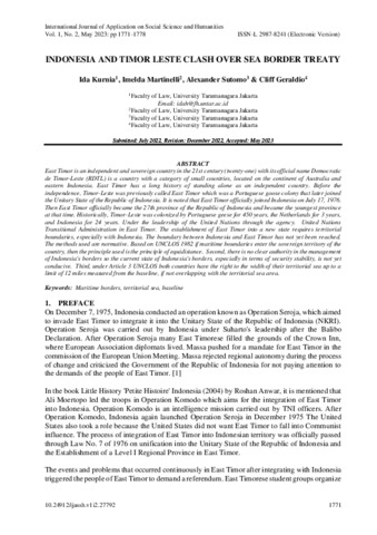 KURNIA, IDA and Martinelli, Imelda and Sutomo, Alexander and Geraldio, Cliff (2023) Indonesia and Timor Leste Clash Over Sea Border Treaty. International Journal of Application on Social Science and Humanities, 1 (2). ISSN 2987-8241