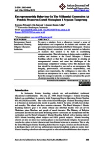 Priyanto, Yuwono and Suryani, Ela and Adjie, Jeannet Kunta (2023) Entrepreneurship Behaviour In The Millennial Generation At Pondok Pesantren Darull Mutaqiuen 1 Sepatan Tangerang. Asian Journal of Social and Humanities, 1 (8).