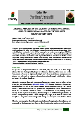 Hardi, Zakiyah Triyana and Djaja, Benny (2023) JURIDICAL ANALYSIS OF THE DIVISION OF INHERITANCE TO THE HEIRS OF DIFFERENT MARRIAGES (DECISION NUMBER 435/PDT/2018/PT MDN). Edunity, 2 (9).