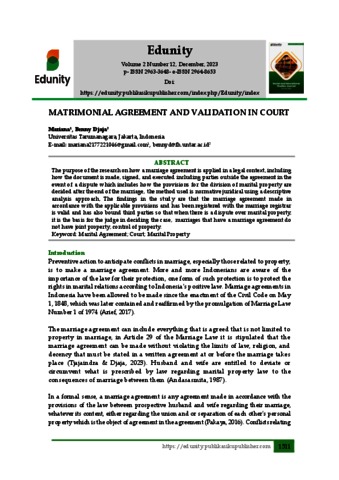 Mariana, Mariana and Djaja, Benny (2023) MATRIMONIAL AGREEMENT AND VALIDATION IN COURT. Edunity, 2 (12).