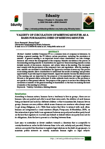 Fernando, Ricco and Djaja, Benny (2023) VALIDITY OF CIRCULATION OF MEETING MINUTES AS A BASIS FOR MAKING DEED OF MEETING MINUTES. Edunity, 2 (12).