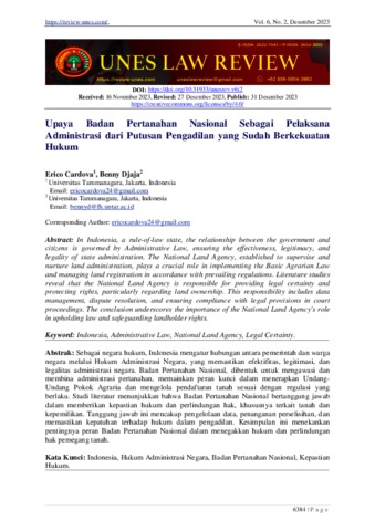 Cardova, Erico and Djaja, Benny (2023) Upaya Badan Pertanahan Nasional Sebagai Pelaksana Administrasi dari Putusan Pengadilan yang Sudah Berkekuatan Hukum. Unes Law Review, 6 (2).