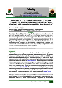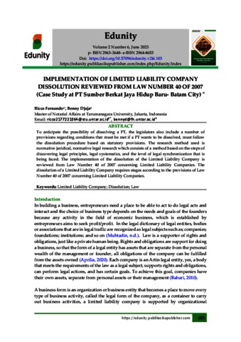 Fernando, Ricco and Djaja, Benny (2023) Implementation Of Limited Liability Company Dissolution Reviewed From Law Number 40 Of 2007 (Case Study at PT Sumber Berkat Jaya Hidup Baru- Batam City). Edunity, 2 (6).