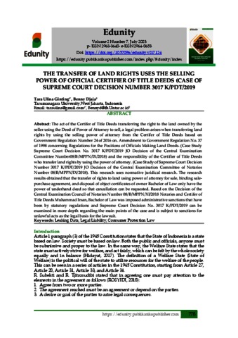 Ginting, Tara Ulina and Djaja, Benny (2023) The Transfer Of Land Rights Uses The Selling Power Of Official Certifier Of Title Deeds (Case Of Supreme Court Decision Number 3017 K/Pdt/2019. Edunity, 2 (7).