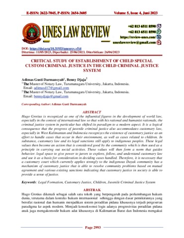 Darmansyah, Adimas Gusti and Djaja, Benny (2023) Critical Study Of Establishment Of Child Special Custom Criminal Justice In The Child Criminal Justice System. Unes law Review, 5 (4).