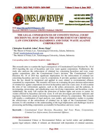 Adam, Chistopher Kendrick and Djaja, Benny (2023) The Legal Consequences Of Constitutional Court Decision No. 18 Of 2014 On The Enforcement Of Criminal Law Concerning Hazardous And Toxic Waste Against Corporations. Unes Law Review, 5 (4).