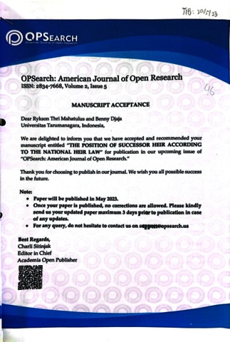 Mahatulus, Rykson Tri and Djaja, Benny (2023) The Position Of Successor Heir According To The National Heir Law. American Journal of Open Research.