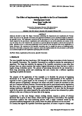 Djaja, Benny and Kristantie, Ardilla Juli (2023) The Effect of Implementing Apostille in the Era of Sustainable Development Goals. International Journal of Application on Social Science and Humanities, 1 (1).