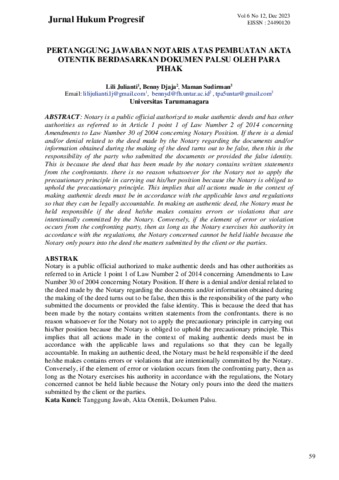 Julianti, Lili and Djaja, Benny and Sudirman, Maman Pertanggung Jawaban Notaris Atas Pembuatan Akta Otentik Berdasarkan Dokumen Palsu Oleh Para Pihak. Jurnal Hukum Progresif.