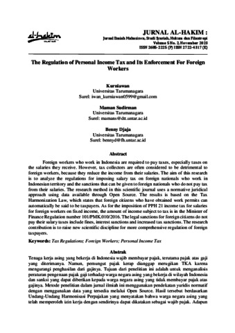 Kurniawan, Kurniawan and Sudirman, Maman and Djaja, Benny (2023) The Regulation of Personal Income Tax and Its Enforcement For Foreign Workers. Jurnal Al-Hakim, 5 (2).