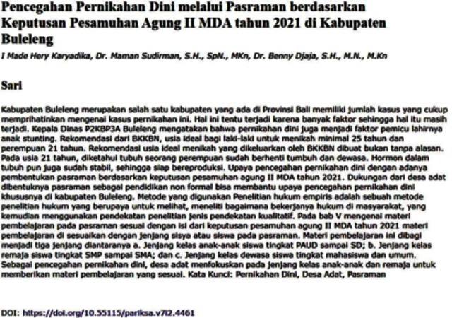 Karyadika, I Made Hery and Sudirman, Maman and Djaja, Benny Pencegahan Pernikahan Dini melalui Pasraman berdasrkan Keputusan Pesamuhan Agung II MDA tahun 2021 di Kabupaten Buleleng. Pariska Jurnal Hukuma Agama Hindu STAN H Mpu Kuturan Singaraja.