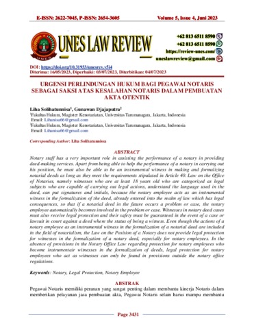 Solihatunnisa, Liha and Djajaputra, Gunawan (2023) URGENSI PERLINDUNGAN HUKUM BAGI PEGAWAI NOTARIS SEBAGAI SAKSI ATAS KESALAHAN NOTARIS DALAM PEMBUATAN AKTA OTENTIK. Unes Law Review, 5 (4).