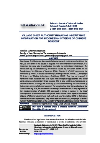 Hanifah, Hanifah and Djajaputra, Gunawan (2023) Village Chief Authority in Making Inheritance Information for Indonesian Citizens of Chinese Descent. Eduvest – Journal of Universal Studies, 3 (7). ISSN 2775-3727