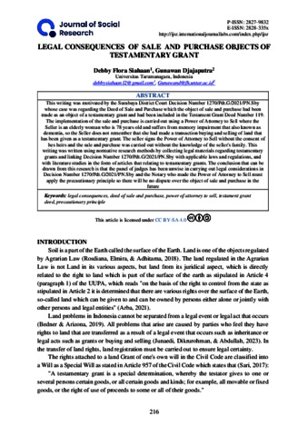 Siahaan, Debby Flora and Djajaputra, Gunawan Legal Consequences of Sale and Purchase Objects of Testamentary Grant. Journal of Social Research.