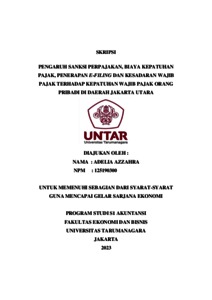 AZZAHRA, ADELIA (2023) PENGARUH SANKSI PERPAJAKAN, BIAYA KEPATUHAN PAJAK, PENERAPAN E-FILING, DAN KESADARAN WAJIB PAJAK TERHADAP KEPATUHAN WAJIB PAJAK ORANG PRIBADI DI DAERAH JAKARTA UTARA. Skripsi thesis, Universitas Tarumanagara.