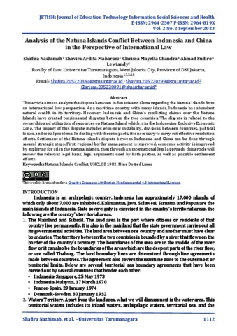 Nazhimah, Shafira and Maharani, Shavira Ardita and Chandra, Clarissa Mayella and Sudiro, Ahmad and Lewiandy, Lewiandy (2023) Analysis of the Natuna Islands Conflict Between Indonesia and China in the Perspective of International Law. JETISH: Journal of Education Technology Information Social Sciences and Health, 2 (2). ISSN 2964-2507