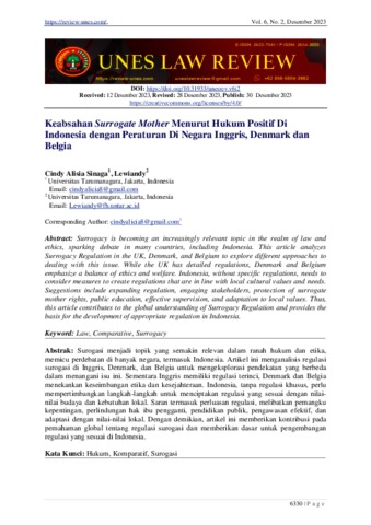 Sinaga, Cindy Alisia and Lewiandy, Lewiandy (2023) Keabsahan Surrogate Mother Menurut Hukum Positif Di Indonesia dengan Peraturan Di Negara Inggris, Denmark dan Belgia. Unes Law Review, 6 (2).