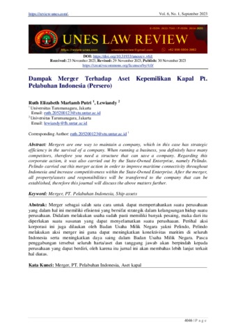 Putri, Ruth Elizabeth Marlamb and Lewiandy, Lewiandy (2023) Dampak Merger Terhadap Aset Kepemilikan Kapal Pt. Pelabuhan Indonesia (Persero). Unes Law Review, 6 (1).