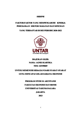 KARTIKA, AGNES (2023) FAKTOR-FAKTOR YANG MEMPENGARUHI KINERJA PERUSAHAAN SEKTOR MAKANAN DAN MINUMAN YANG TERDAFTAR DI BEI PERIODE 2020-2022. Skripsi thesis, Universitas Tarumanagara.