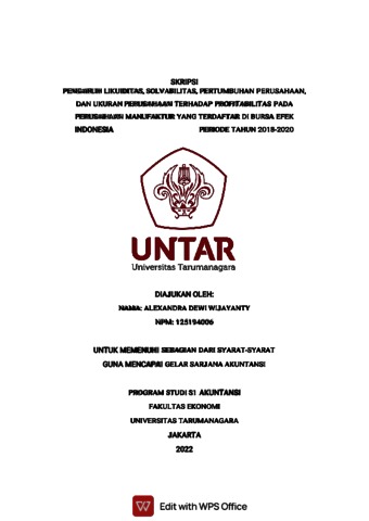 WIJAYANTY, WIJAYANTY (2022) PENGARUH LIKUIDITAS, SOLVABILITAS, PERTUMBUHAN PERUSAHAAN, DAN UKURAN PERUSAHAAN TERHADAP PROFITABILITAS PADA PERUSAHAAN MANUFAKTUR YANG TERDAFTAR DI BURSA EFEK INDONESIA PERIODE TAHUN 2018-2020. Skripsi thesis, Universitas Tarumanagara.