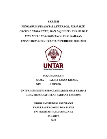 KIRANA, ALIKA LAKSA (2023) PENGARUH FINANCIAL LEVERAGE, FIRM SIZE, CAPITAL STRUCTURE, DAN LIQUIDITY TERHADAP FINANCIAL PERFORMANCE PERUSAHAAN CONSUMER NON-CYCLICALS PERIODE 2019-2021. Skripsi thesis, Universitas Tarumanagara.
