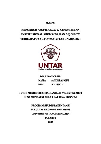 GUI, ANDREAS (2023) PENGARUH PROFITABILITY, KEPEMILIKAN INSTITUSIONAL, FIRM SIZE, DAN LIQUIDITY TERHADAP TAX AVOIDANCE TAHUN 2019-2021. Skripsi thesis, Universitas Tarumanagara.