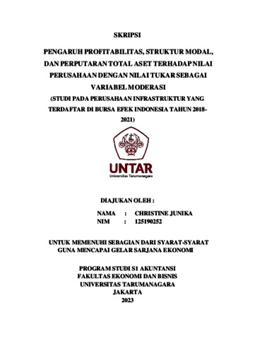 JUNIKA, CHRISTINE (2023) PENGARUH PROFITABILITAS, STRUKTUR MODAL, DAN PERPUTARAN TOTAL ASET TERHADAP NILAI PERUSAHAAN DENGAN NILAI TUKAR SEBAGAI VARIABEL MODERASI (STUDI PADA PERUSAHAAN INFRASTRUKTUR YANG TERDAFTAR DI BURSA EFEK INDONESIA TAHUN 2018- 2021). Skripsi thesis, Universitas Tarumanagara.