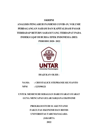 SILVIANTO, CRYSTALICE STEPHANIE (2022) ANALISIS PENGARUH PANDEMI COVID-19, VOLUME PERDAGANGAN SAHAM DAN KAPITALISASI PASAR TERHADAP RETURN SAHAM YANG TERDAPAT PADA INDEKS LQ45 DI BURSA EFEK INDONESIA (BEI) PERIODE 2020- 2022. Skripsi thesis, Universitas Tarumanagara.