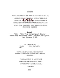 NATASHYA, ELSA (2023) PENGARUH PROFITABILITAS, UKURAN PERUSAHAAN, LIKUIDITAS DAN STRUKTUR AKTIVA TERHADAP STRUKTUR MODAL PADA PERUSAHAAN SEKTOR CONSUMER NON-CYYCLICALS YANG TERDAFTAR DI BURSA EFEK INDONESIA (BEI) PERIODE 2018-2020. Skripsi thesis, Universitas Tarumanagara.