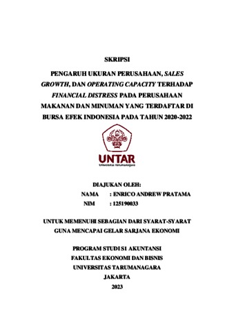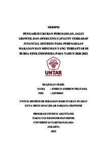PRATAMA, ENRICO ANDREW (2023) PENGARUH UKURAN PERUSAHAAN, SALES GROWTH, DAN OPERATING CAPACITY TERHADAP FINANCIAL DISTRESS PADA PERUSAHAAN MAKANAN DAN MINUMAN YANG TERDAFTAR DI BURSA EFEK INDONESIA PADA TAHUN 2020-2022. Skripsi thesis, Universitas Tarumanagara.