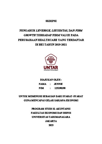 JENNIE, JENNIE (2023) PENGARUH LEVERSGE, LIKUIDITAS, DAN FIRM GROWTH TERHADAP FIRM VALUE PADA PERUSAHAAN HEALTHCARE YANG TERDAFTAR DI BEI TAHUN 2019-2021. Skripsi thesis, Universitas Tarumanagara.