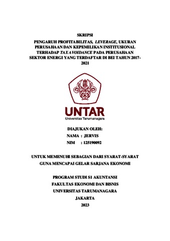 JERVIS, JERVIS (2023) PENGARUH PROFITABILITAS, LEVERAGE, UKURAN PERUSAHAAN DAN KEPEMILIKAN INSTITUSIONAL TERHADAP TAX AVOIDANCE PADA PERUSAHAAN SEKTOR ENERGI YANG TERDAFTAR DI BEI TAHUN 20172021. Skripsi thesis, Universitas Tarumanagara.