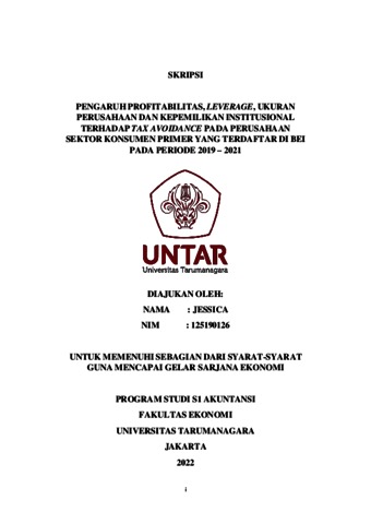 JESSICA, JESSICA (2022) PENGARUH PROFITABILITAS, LEVERAGE, UKURAN PERUSAHAAN DAN KEPEMILIKAN INSTITUSIONAL TERHADAP TAX AVOIDANCE PADA PERUSAHAAN SEKTOR KONSUMEN PRIMER YANG TERDAFTAR DI BEI PADA PERIODE 2019 – 2021. Skripsi thesis, Universitas Tarumanagara.